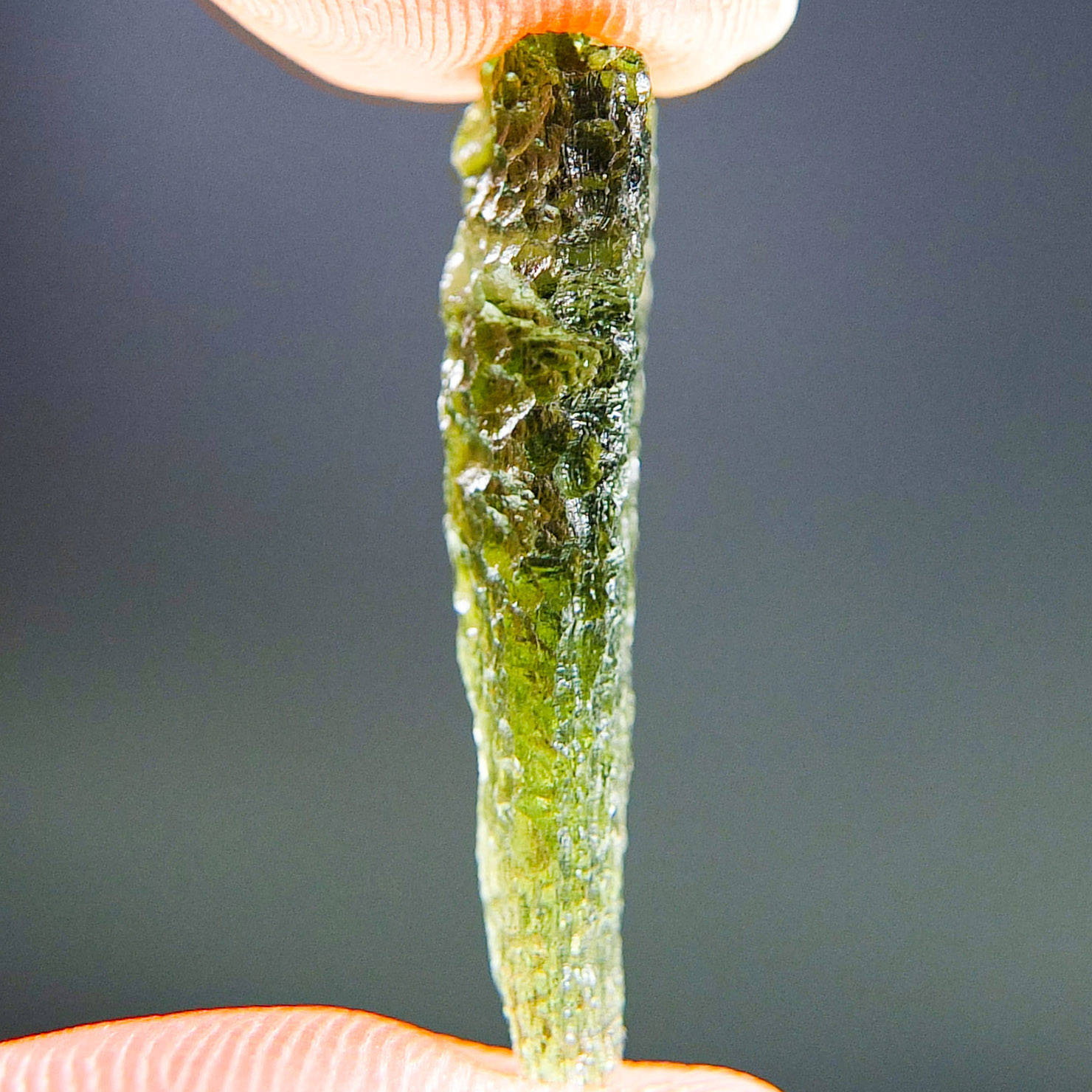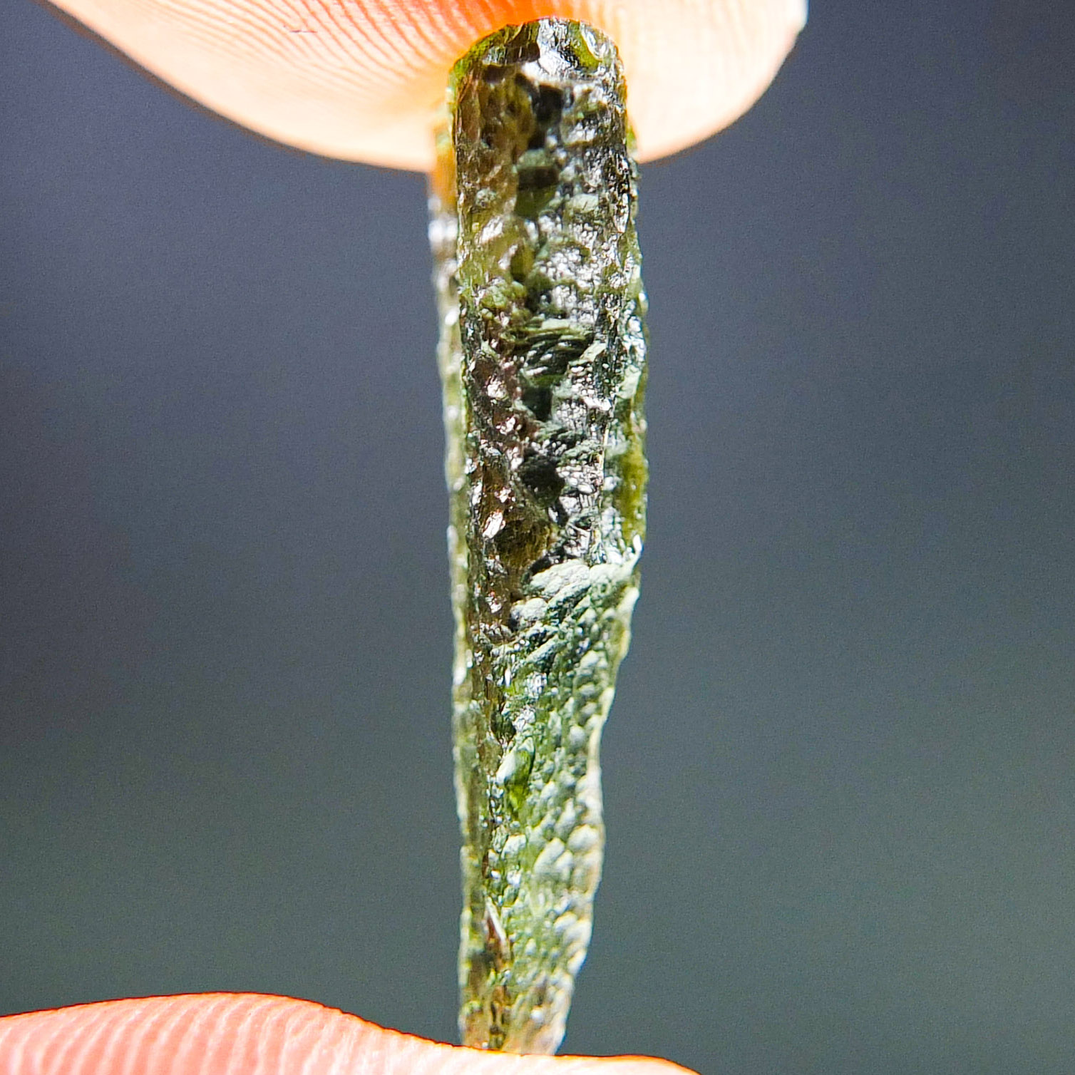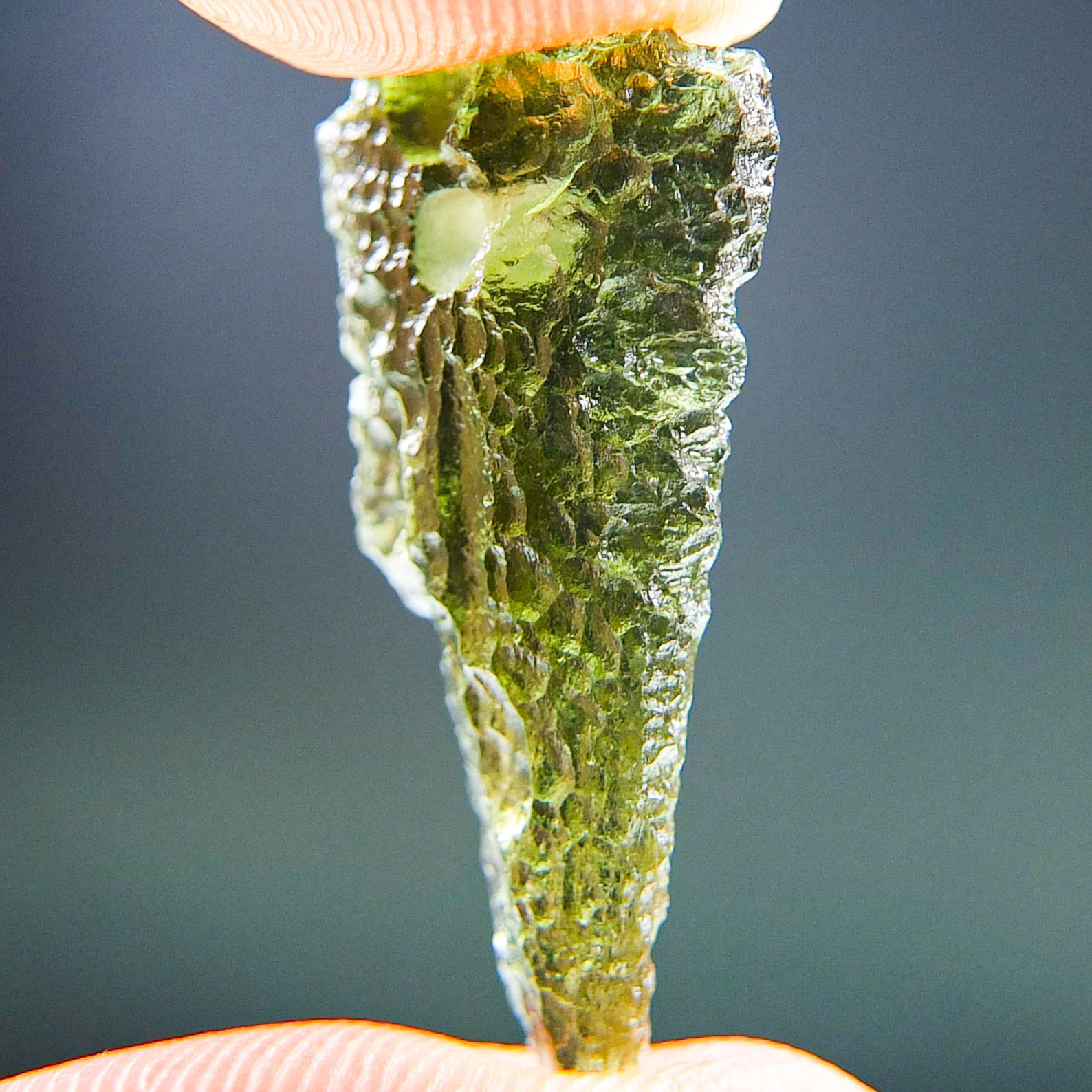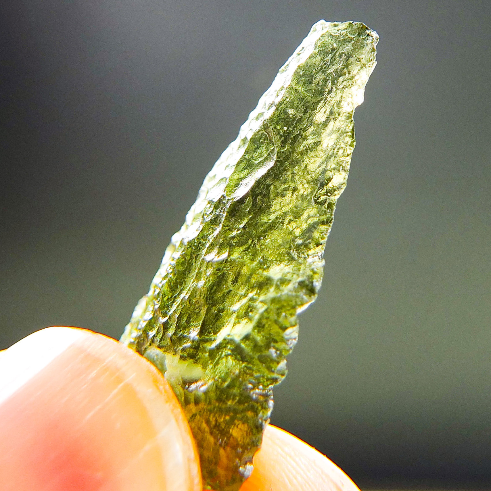Certified Moldavite with A quality. From deposit Chlum. Shape: Drop – natural upper fragment.