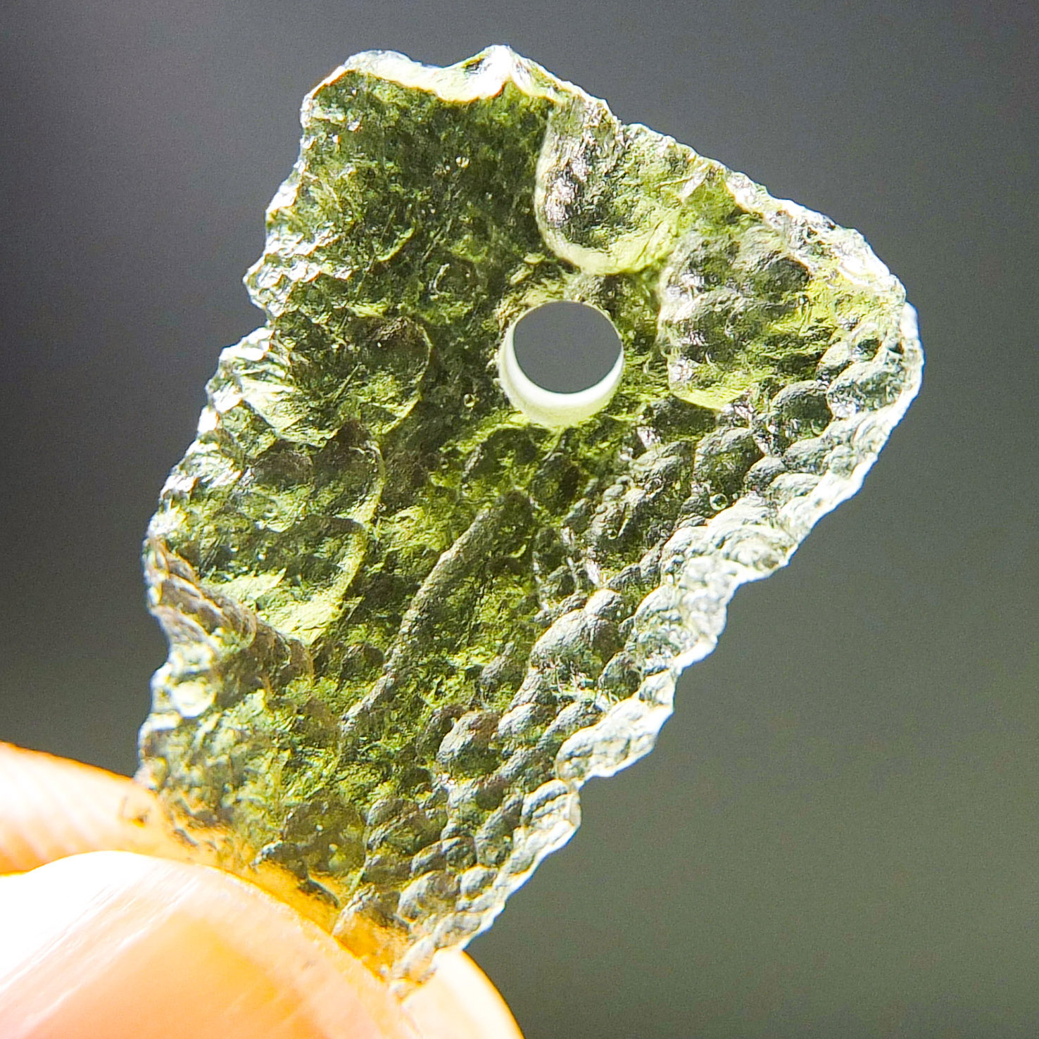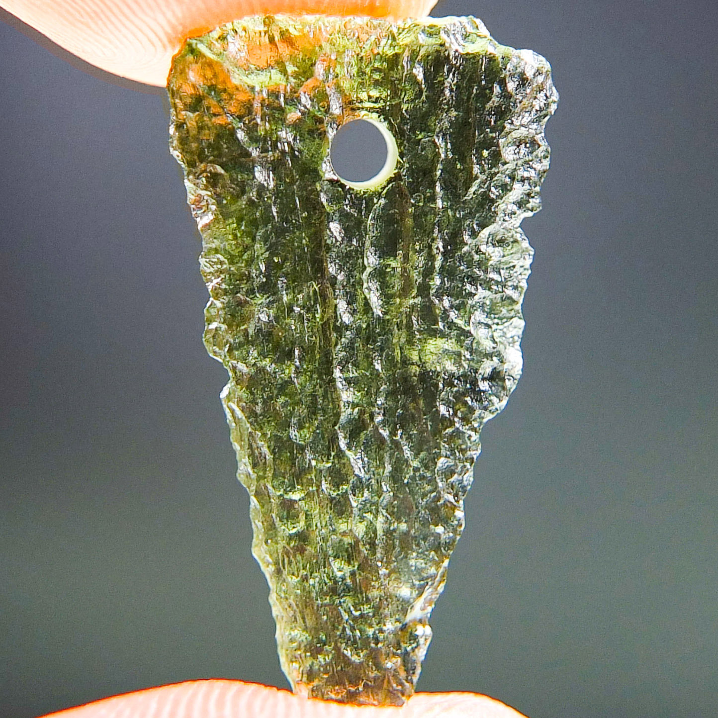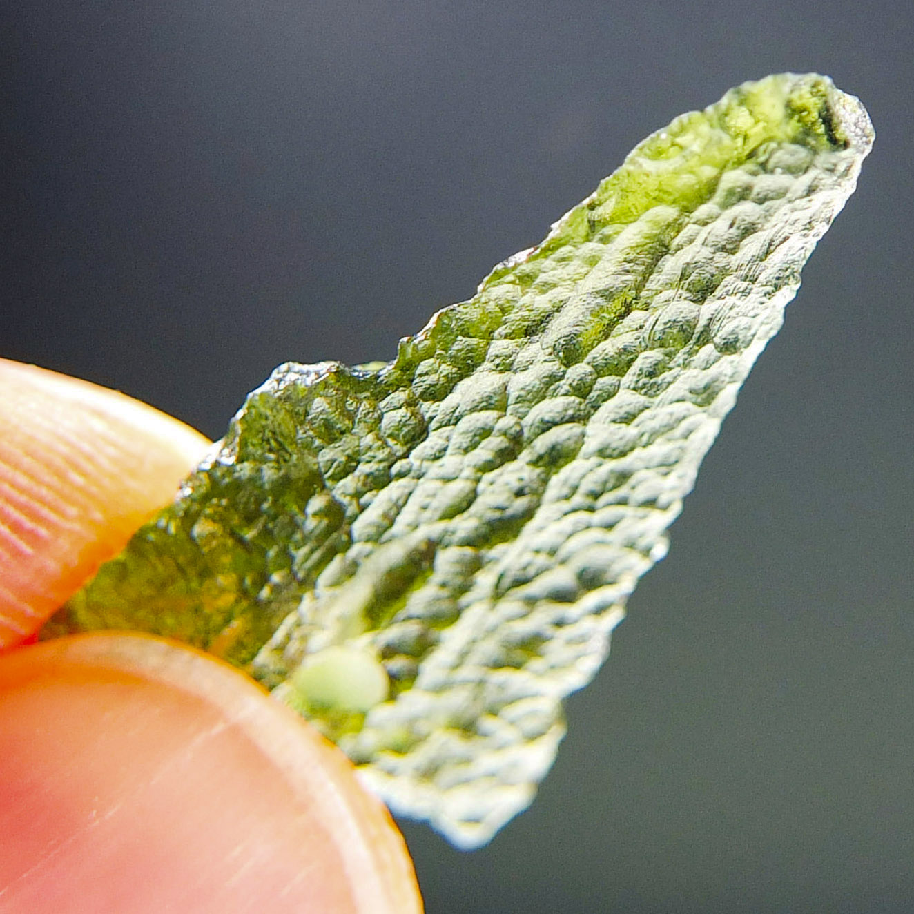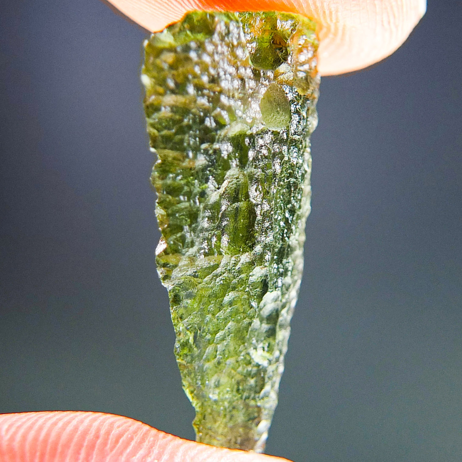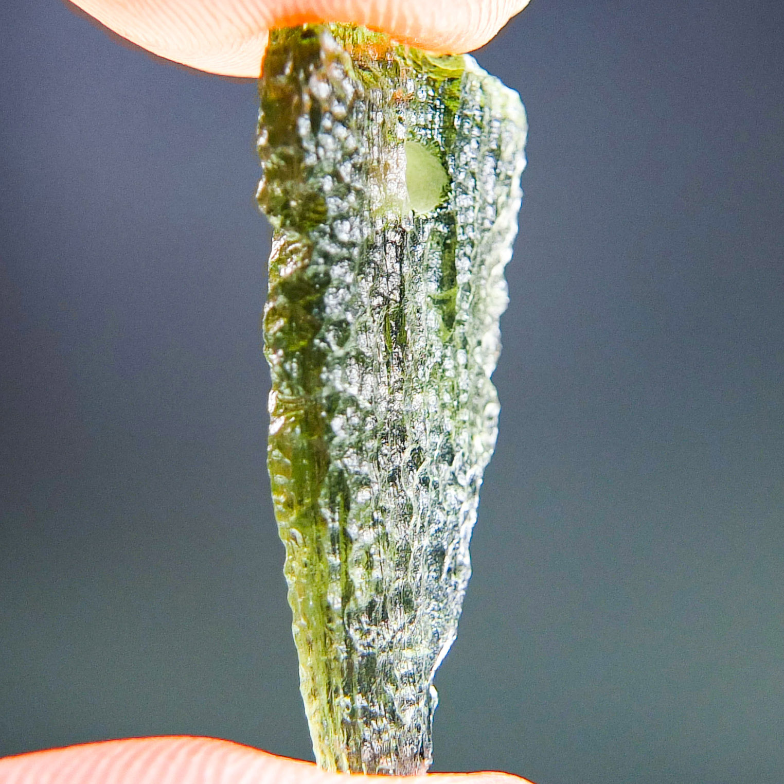 Certified Moldavite with A quality. From deposit Chlum. Shape: Drop – natural upper fragment.