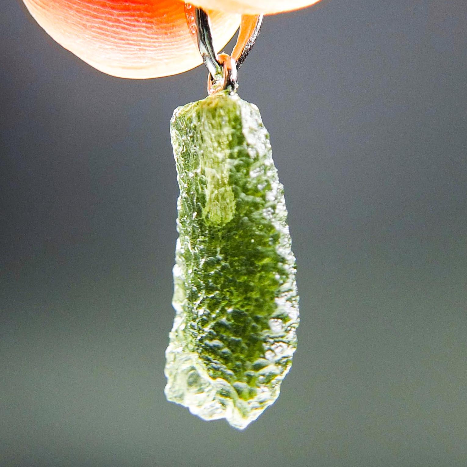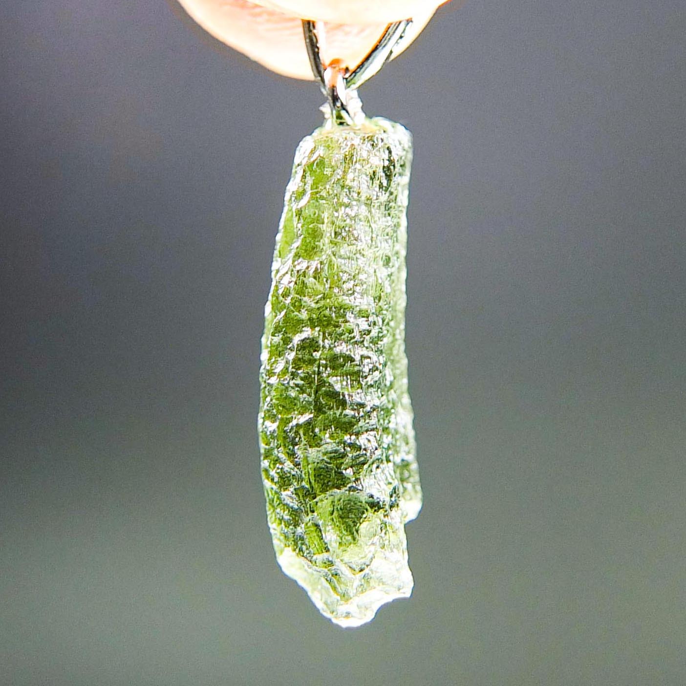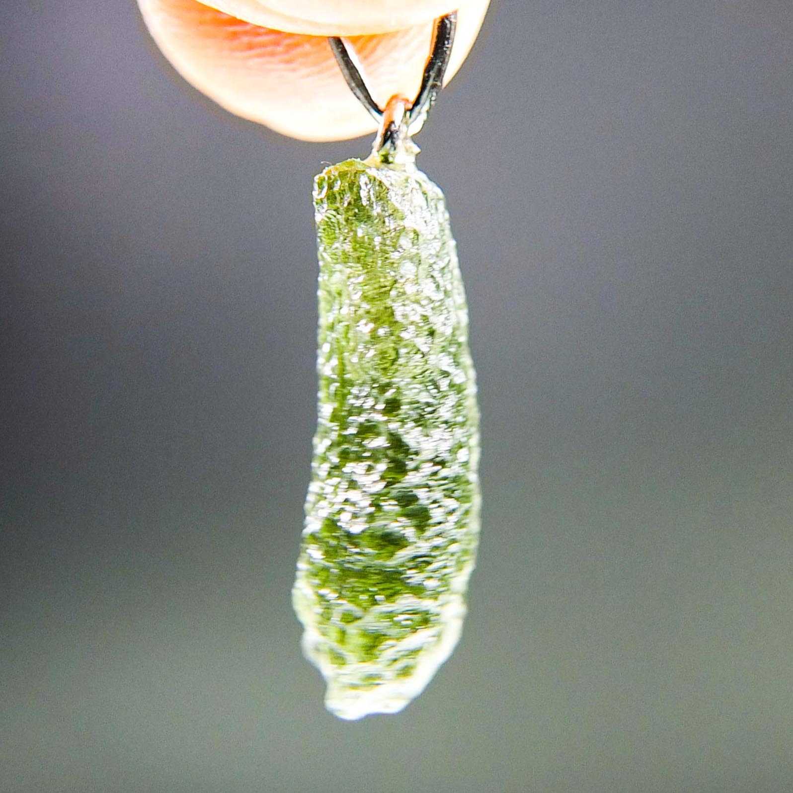 Certified Moldavite with A quality. From deposit Chlum. Shape: Drop – natural lower fragment (belly).
