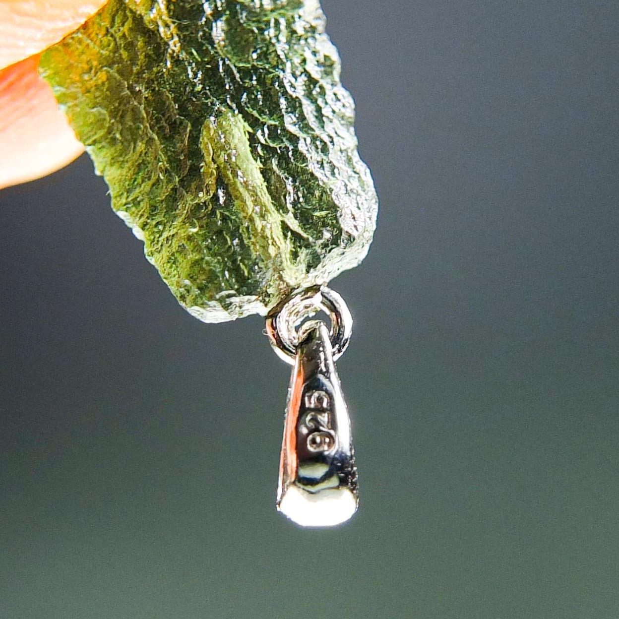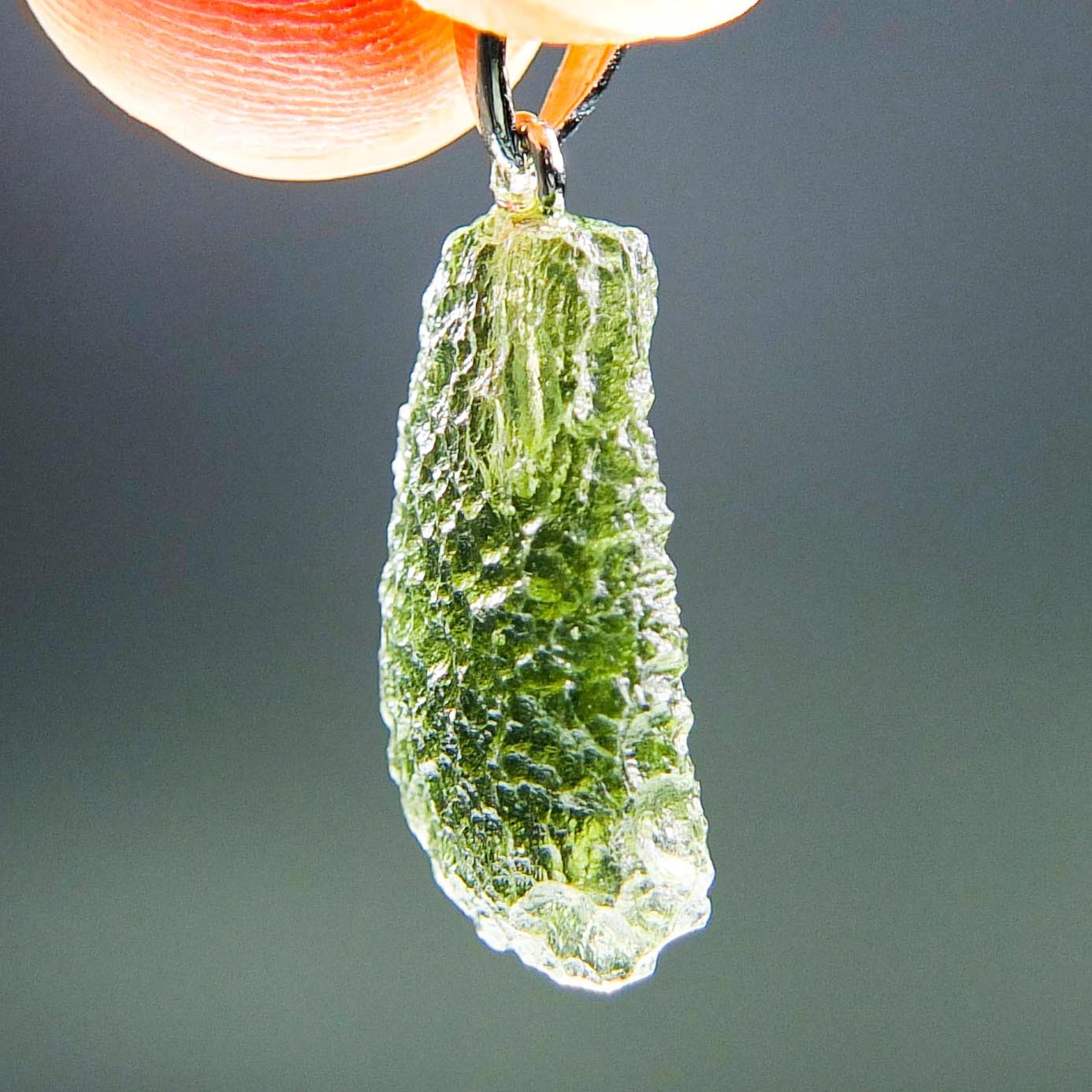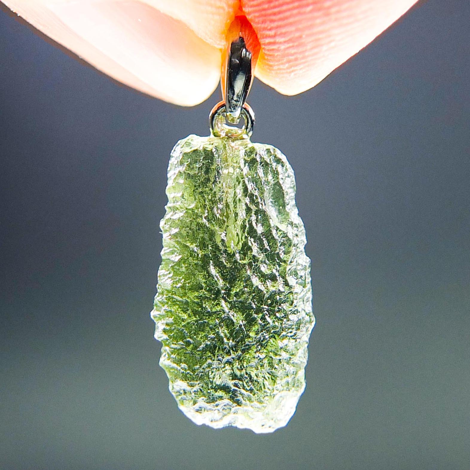 Certified Moldavite with A quality. From deposit Chlum. Shape: Drop – natural lower fragment (belly).