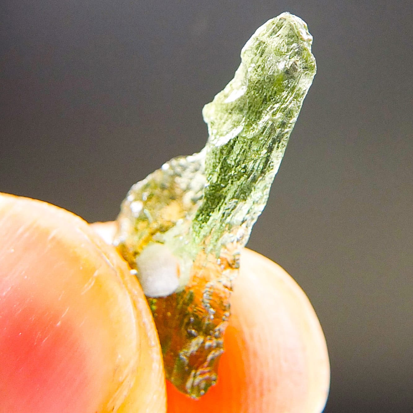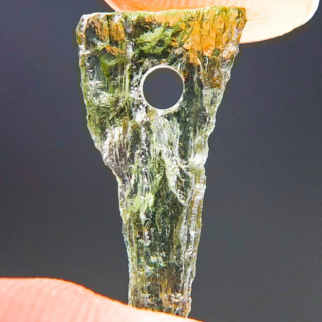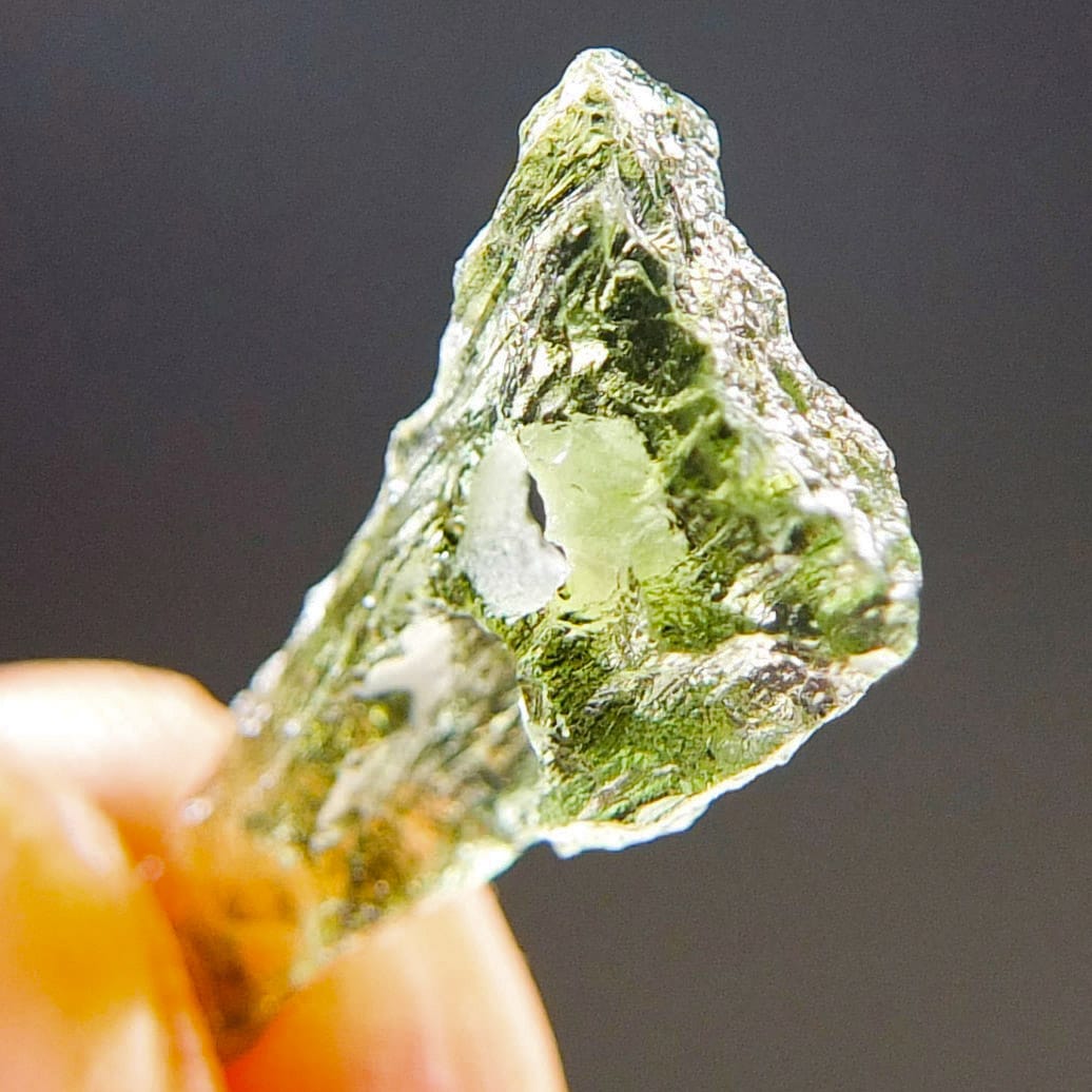 Certified Moldavite with A quality. From deposit Chlum. Shape: Drop – natural upper fragment.